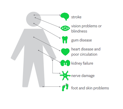 Diabetes can cause health problems throughout the body over time. These are called complications of diabetes. They are more likely to happen if your blood sugar is often too high. They can also happen if your diabetes isn’t under good control. High blood sugar can damage blood vessels in your body over time. It’s important to keep your blood sugar in your target range. This can help prevent or delay complications. Here are some of the complications related to diabetes:3